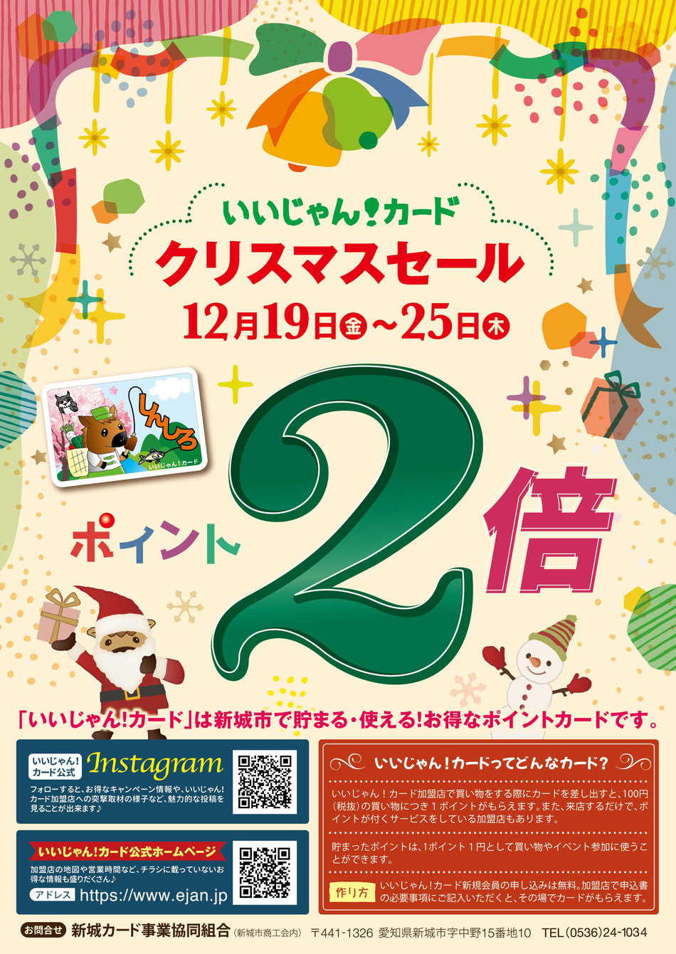 「いいじゃん!カード」は、新城市内のお店(加盟店)でお買物をするとポイントが付くIC型カードです。お買物100円毎に1ポイントを差し上げます(原則)。この他、来店される毎(1日1回)や催事イベント時にポイントが付くサービスを行うお店もあります。